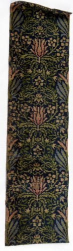 ‘Lily’ was William Morris’s first design for a wool pile carpet. It was machine woven on a jaquard loom for Morris & Co. by Yates & Co. in Wilton, and from 1905 its successor, Wilton Royal Carpet Company. The repeating pattern is formed of stylized lily plants intertwined with scrolling flowers on a dark blue background. Although the design wasn’t registered with the Patent Office it was in production in 1877, along with a number of other designs, when Morris advised the Countess of Tullamore in Ireland on the decoration of her house. Wilton carpets were the most popular type of machine woven carpets made by Morris & Co., and of the 24 different designs available ‘Lily’ was a best seller.