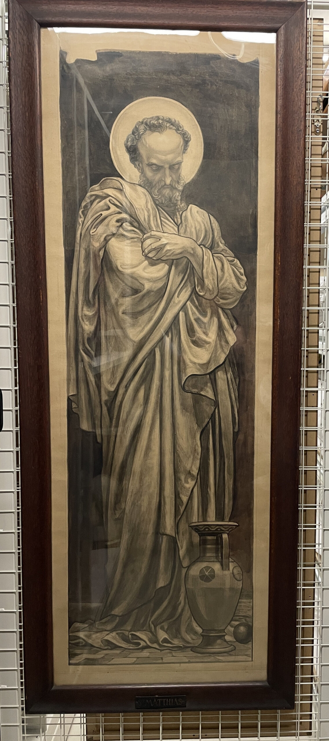 Cartoon by Frederic James Shields for stained glass at the Duke of Westminster’s chapel at Eaton Hall, Chester. Signed ’18 FS 80′. The drawing was discovered, along with others by Shields in the YMCA in Tottenham Court Road, London by the artist Frank Brangwyn.