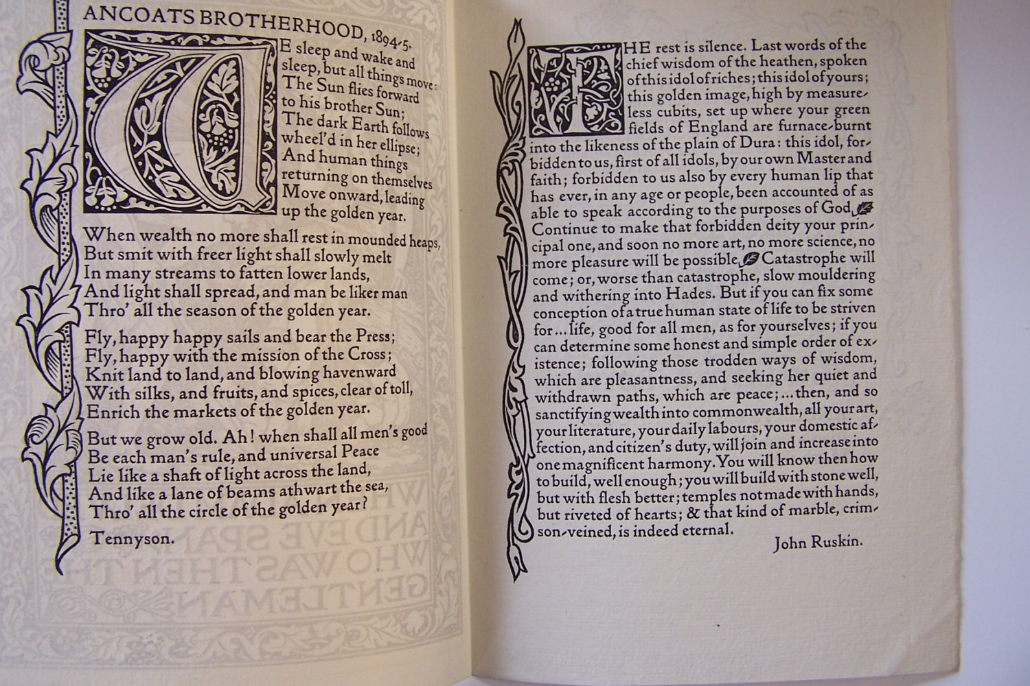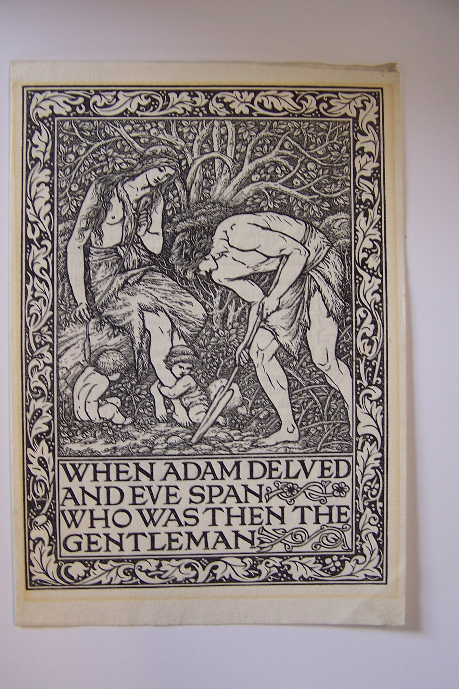 The leaflet features extracts from Alfred, Lord Tennyson, and John Ruskin, along with wood-engraved initials, borders, and a press device designed by Morris. It includes the illustration When Adam Delved and Eve Span, designed by Edward Burne-Jones with lettering by Morris. This image first appeared as an etched frontispiece in the 1888 Reeves & Turner edition of Morris’s A Dream of John Ball (see K6), which was originally serialized in The Commonweal in 1887.