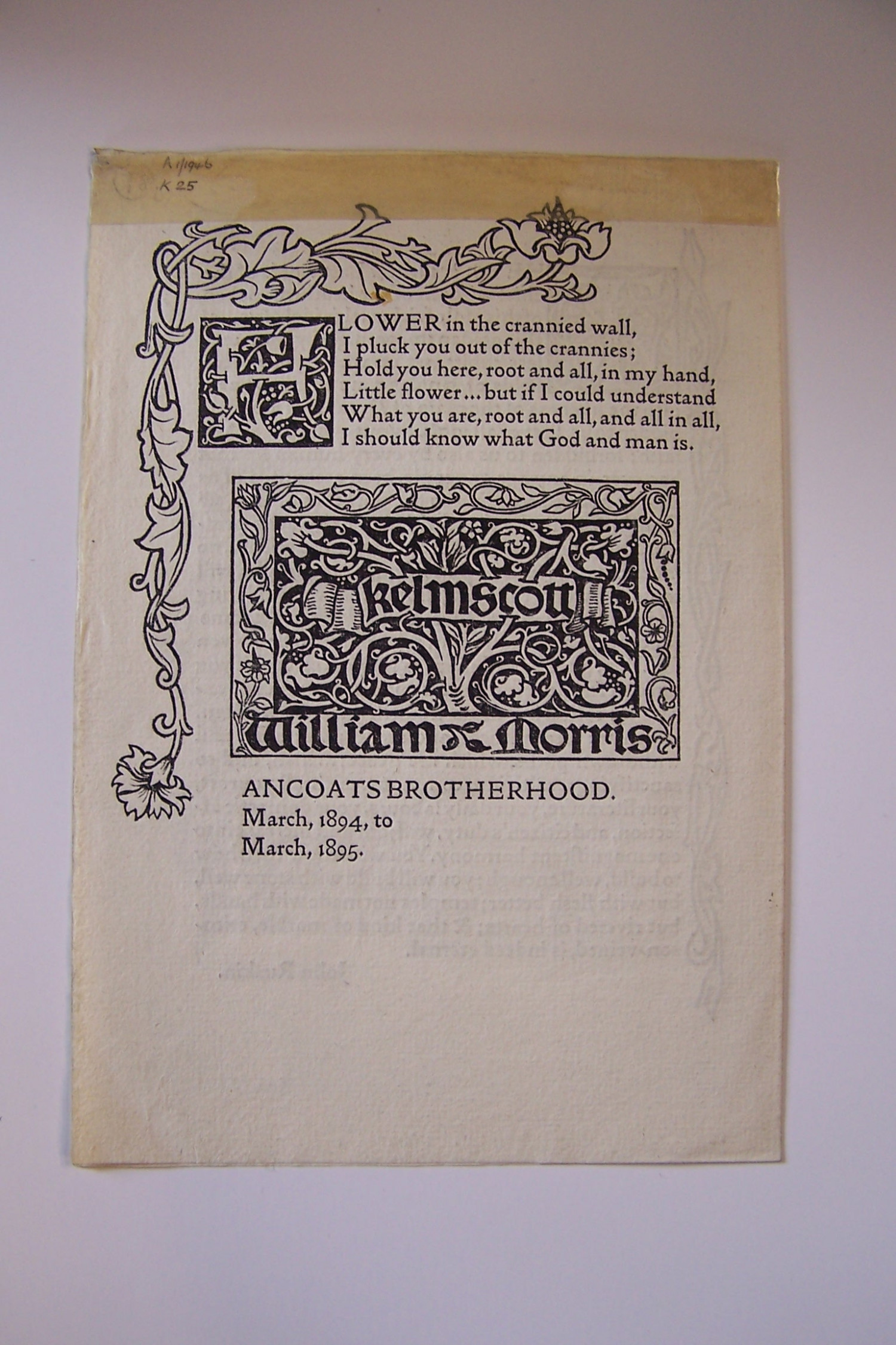 This leaflet advertises the Ancoats Brotherhood, Manchester, printed by the Kelmscott Press. The Ancoats Brotherhood was founded by Charles Rowley in 1882 as the Ancoats Recreation Committee. In 1889, it was reformed as the Ancoats Brotherhood, offering a year-long programme of lectures, musical evenings, concerts, dances, walks, art exhibitions, and social gatherings. Notable guests included William Morris, Walter Crane, and George Bernard Shaw. Morris lectured there annually until 1894.