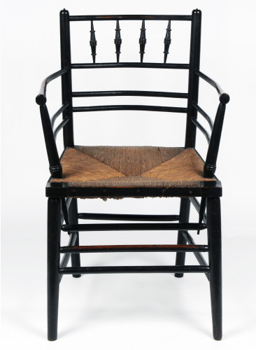 Rush-seated armchair in turned, ebonised wood frame and rush seat. This chair has been widely attributed to the designer Philip Webb in the early 1860s. It was manufactured by Morris, Marshall, Faulkner and Co. and continuously produced by Morris & Co. until the twentieth century. The full range include armless chairs and a three-seater settle. The name ‘Sussex’ chair can be attributed to Morris’s biographer J.W. Mackail who commented that the chair was adapted from a country chair found in Sussex. Black or red Sussex chairs were used in Morris’s first family home Red House and this example was acquired from Jessie Jack, who’s parents George and Annie Jack, both worked for Morris & Co. Another version of this armchair without the spindles in the back was also produced by the Firm, see G27a&b.