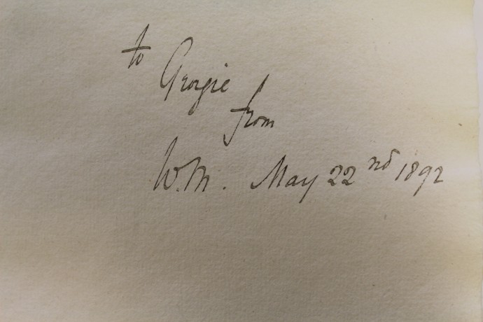 ‘The Defence of Guenevere’, Morris’s first volume of poems, was originally published by Bell & Daldy 1858. Owing to a number of errors in this first edition an errata slip was included in this first edition. However, when the book was reprinted by Ellis & White in 1875, these errors were not wholly corrected and many of them also appear in the text of the Kelmscott Press edition. This was the first Kelmscott Press book to be bound in limp vellum and the only one in which the title was inscribed by hand on the spine. This copy was given by William Morris to his good friend Georgian Burne-Jones and is inscribed by him with the date 22nd May 1892. 300 copies were printed on paper at 2 guineas, 10 on vellum at about 12 guineas and sold by Reeves & Turner.
