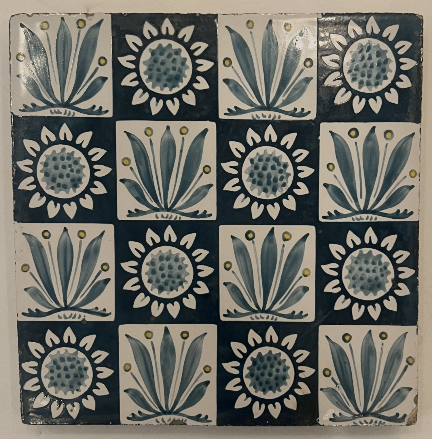 Tile with sixteen squares of alternating patterns of sunflowers and daisy clumps; no other examples of this tile design have been found. In technique it is comparable to tiles painted by the Morris firm in the early 1870s, but the design more closely resembles designs by William De Morgan. One possibility is that it was designed by De Morgan in the period from the late 1860s-1870s, when he was doing occasional work for the Firm.